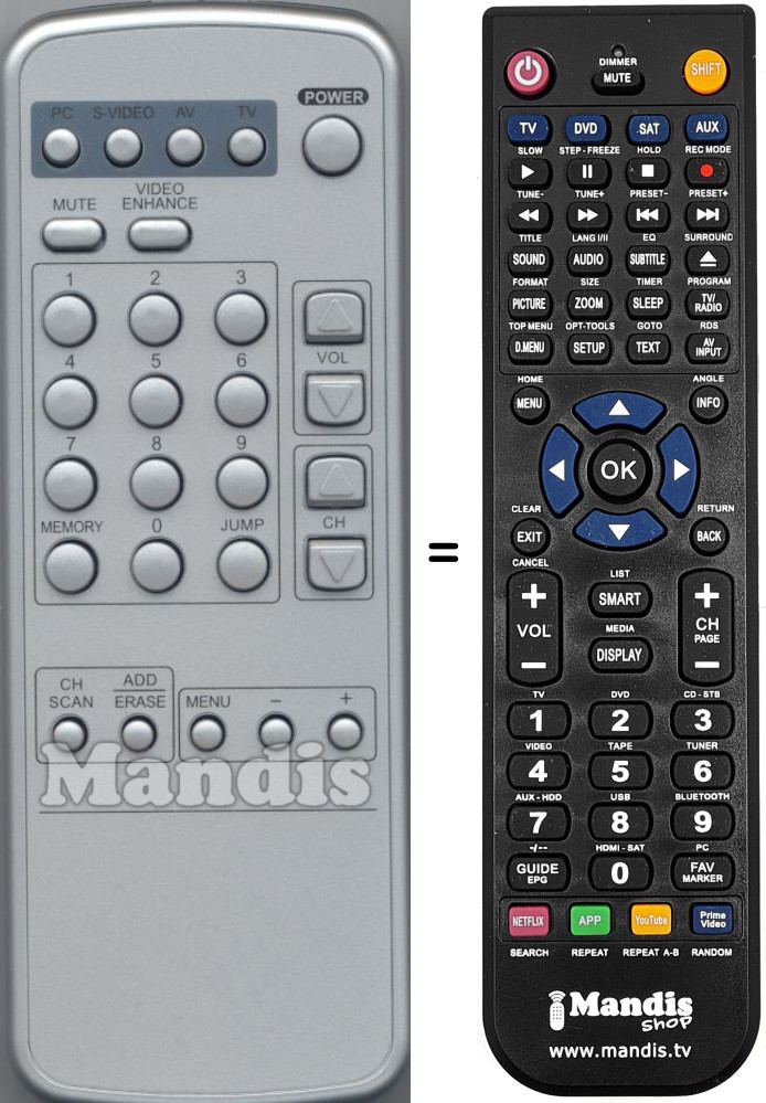 Fernbedienung, die das Original und die Gesamtheit seiner Funktionen, vollständig ersetzt. Es handelt sich jedoch nicht um eine Universalfernbedienung sondern um eine Fernbedienung die das Original ersetzt. Sie erhalten eine nach Einlegen der Batterien sofort einsatzbereite Fernbedienung. Jegliches Programmieren entfällt. Wir geben umfassende Garantie dafür, dass diese Fernbedienung alle Funktionen der Originalfernbedienung erfüllt.