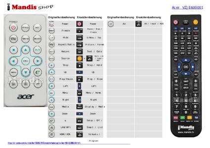 Im Folgenden zeigen wir Ihnen die Zuordnung jedes einzelnen Knopfes der Originalfernbedienung zu der Taste, die dieselbe Funktion auf der Ersatzfernbedienung ausführt. In einigen Fällen müssen Sie möglicherweise die UMSCHALT-Taste drücken, bevor Sie eine andere Taste drücken, um bestimmte Aktionen auszuführen. Diese zusätzlichen Funktionen werden oft wenig genutzt und dienen dazu, das Verständnis der Ersatzfernbedienung zu erleichtern oder weil die Originalfernbedienung mehr Tasten hat als das entsprechende Modell.