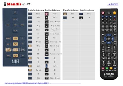 Im Folgenden zeigen wir Ihnen die Zuordnung jedes einzelnen Knopfes der Originalfernbedienung zu der Taste, die dieselbe Funktion auf der Ersatzfernbedienung ausführt. In einigen Fällen müssen Sie möglicherweise die UMSCHALT-Taste drücken, bevor Sie eine andere Taste drücken, um bestimmte Aktionen auszuführen. Diese zusätzlichen Funktionen werden oft wenig genutzt und dienen dazu, das Verständnis der Ersatzfernbedienung zu erleichtern oder weil die Originalfernbedienung mehr Tasten hat als das entsprechende Modell.