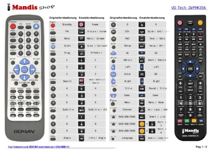 Ein Dokument ist enthalten, um die Verwendung der neuen Fernbedienung zu erleichtern, indem es die Tastenbelegung zeigt.