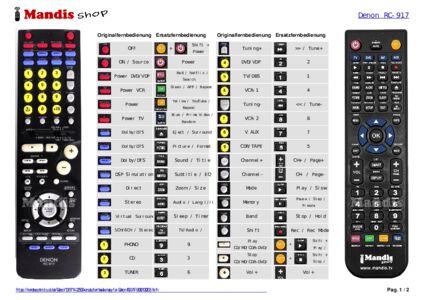 Diese Fernbedienung erfüllt alle Funktionen der Originalfernbedienung: On / Source, Off, Power DVD/VDP, Power VCR, Power DBS/CAble, Power TV, Dolby/DTS Surround, Dolby/DTS Cinema, Dolby/DTS Music, DSP Simulation, Direct, Stereo, Virtual Surround, 5CH/6CH Stereo, 1 / PHONO, 2 / CD, 3 / TUNER, 4 / DVD/VDP, 5 / TV/DBS, 6 / VCR-1, 7 / VCR-2, 8 / V.AUX, 9 / CDR/TAPE, 0, +10, TV/VCR, Tuning+ / TV Vol+, Tuning- / TV Vol-, Channel+, Channel-, Mode, Memory, Band, Shift, Play, Stop, I<< / Channel-, >>I / Channel+, <<, >>, Pause / A/B, Rev. Play / Disc Skip+, Volume+, Volume-, Muting, System Setup / Setup, Surround Parameter / Menu / Guide, Up, Left, CH Select / Enter, Right, Down, Status / Display, Surround Back / Return, Test Tone, Video Select, Dimmer, , Input Mode, Input Analog, Input Ext.In