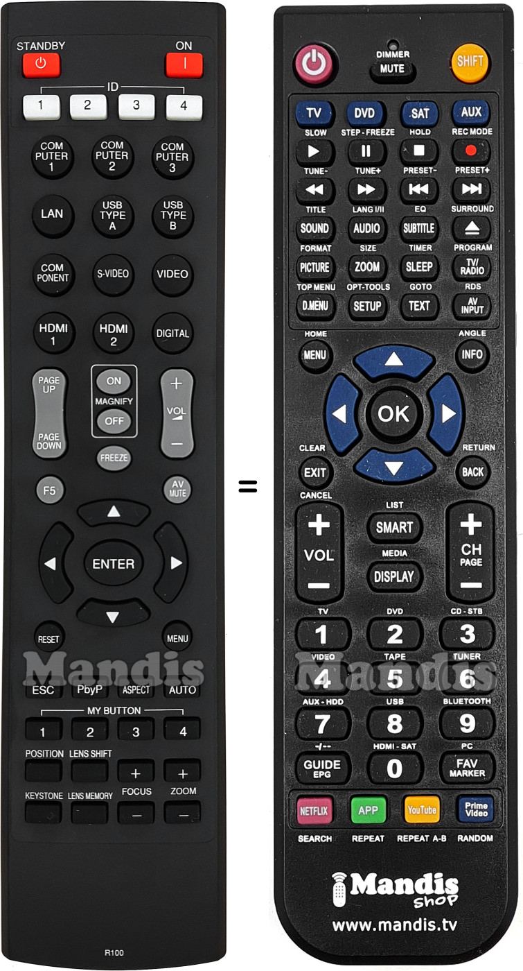 Standby, On, ID 1, ID 2, ID 3, ID 4, Computer 1, Computer 2, Computer 3, LAN, USB Type A, USB Type B, COM Ponent, S-Video, Video, HDMI 1, HDMI 2, Digital, Page Up, Page Down, Magnify On, Magnify Off, Vol +, Vol -, Freeze, F5, AV Mute, Up, Right, Down, Left, Enter, Reset, Menu, ESC, PbyP, Aspect, Auto, My Button 1, My Button 2, My Button 3, My Button 4, Position, Lens Shift, Keystone, Lens Memory, Focus +, Focus -, Zoom +, Zoom -