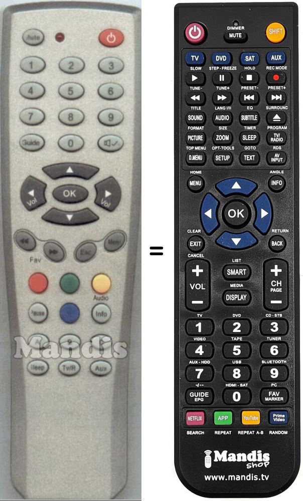 Fernbedienung, die das Original und die Gesamtheit seiner Funktionen, vollständig ersetzt. Es handelt sich jedoch nicht um eine Universalfernbedienung sondern um eine Fernbedienung die das Original ersetzt. Sie erhalten eine nach Einlegen der Batterien sofort einsatzbereite Fernbedienung. Jegliches Programmieren entfällt. Wir geben umfassende Garantie dafür, dass diese Fernbedienung alle Funktionen der Originalfernbedienung erfüllt.