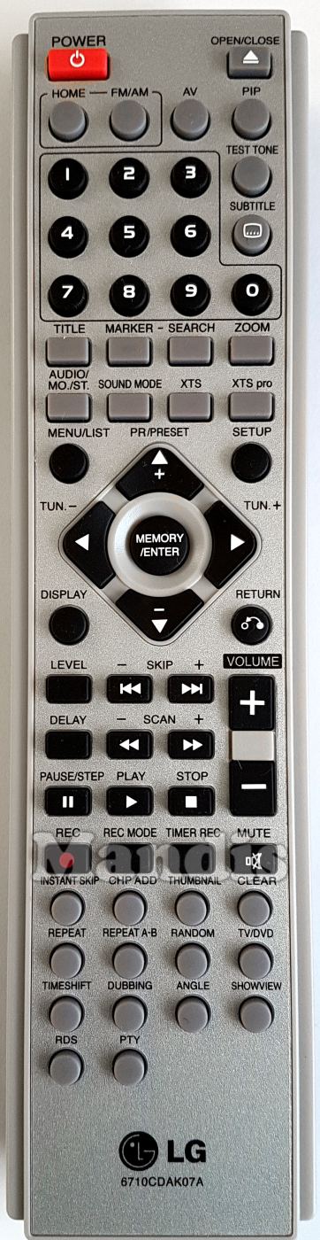 Power, Open / Close, Home, FM / AM, AV, PIP, Test Tone, Subtitle, 1, 2, 3, 4, 5, 6, 7, 8, 9, 0, Title, Marker, Search, Zoom, Audio / Mo. / St., Sound Mode, XTS, XTS pro, Menu / List, Setup, Up / Pr + / Preset +, Down / Pr - / Preset -, Right / Tun +, Left / Tun -, Memory / Enter, Display, Return, Level, I<< / Skip -, >>I / Skip +, Delay, << / Scan -, >> / Scan +, Volume +, Volume -, Pause / Step, Play, Stop, Rec, Rec Mode, Timer Rec, Mute, Instant Skip, CHP ADD, Thumbnail, Clear, Repeat, Repeat A-B, Random, TV / DVD, Timeshift, Dubbing, Angle, Showview, RDS, PTY