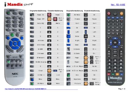 Diese Fernbedienung erfüllt alle Funktionen der Originalfernbedienung: Power On, Power Off, Auto Adj., 1, 2, 3, 4 / Video, 5 / S-Video, 6 / HDMI, 7 / Viewer, 8 / Network, 9 / USB Display, ID Set / +, 0, Clear, Menu, AV - Mute, Freeze, Exit, Up, Down, Right, Left, Enter, D-Zoom +, D-Zoom -, Page +, Page -, Mouse L-Click, Mouse R-Click, ECO, Keystone, Picture, Help, Aspect, Vol +, Vol -, Focus / Zoom
