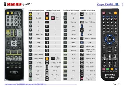 Diese Fernbedienung erfüllt alle Funktionen der Originalfernbedienung: On, Standby, Rem. Mode Receiver / Tape / AMP, Rem. Mode DVD, Rem. Mode CD / MD / CDR, Rem. Mode TV, Rem. Mode VCR, Rem. Mode SAT / CABLE, 1 / Inp. Sel V1, 2 / Inp. Sel V2, 3 / Inp. Sel V3, 4, 5 / Inp. Sel Multi CH, 6 / Inp. Sel DVD, 7 / Inp. Sel Tape, 8 / Inp. Sel Tuner, 9 / Inp. Sel CD, 0 / 11 / Dimmer, +10 / 10 / -/--, CLR / 12 / Sleep, TV Power, TV Input, TV Vol +, TV Vol -, TV CH + / Disc +, TV CH - / Disc -, Vol +, Vol -, Guide / Top Menu / SP A/B, Previous Menu / Muting, Up, Left, Enter, Right, Down, Return, Setup, Pause / Play Reverse, Play, Stop, <<, >>, I<<, >>I, Listening Mode Stereo, Listening Mode Surround, Listening Mode Prev., Listening Mode Next, Test Tone / Audio, CH Sel / Subtitle, Level - / Random, Level + / Repeat, Display, Play Mode, L. Night / HDD, Cine Fltr / DVD