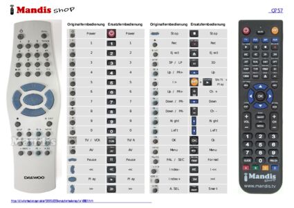 Im Folgenden zeigen wir Ihnen die Zuordnung jedes einzelnen Knopfes der Originalfernbedienung zu der Taste, die dieselbe Funktion auf der Ersatzfernbedienung ausführt. In einigen Fällen müssen Sie möglicherweise die UMSCHALT-Taste drücken, bevor Sie eine andere Taste drücken, um bestimmte Aktionen auszuführen. Diese zusätzlichen Funktionen werden oft wenig genutzt und dienen dazu, das Verständnis der Ersatzfernbedienung zu erleichtern oder weil die Originalfernbedienung mehr Tasten hat als das entsprechende Modell.