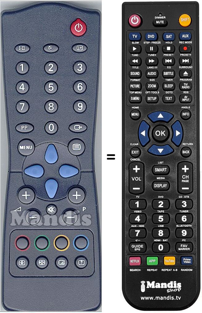 Fernbedienung, die das Original und die Gesamtheit seiner Funktionen, vollständig ersetzt. Es handelt sich jedoch nicht um eine Universalfernbedienung sondern um eine Fernbedienung die das Original ersetzt. Sie erhalten eine nach Einlegen der Batterien sofort einsatzbereite Fernbedienung. Jegliches Programmieren entfällt. Wir geben umfassende Garantie dafür, dass diese Fernbedienung alle Funktionen der Originalfernbedienung erfüllt.