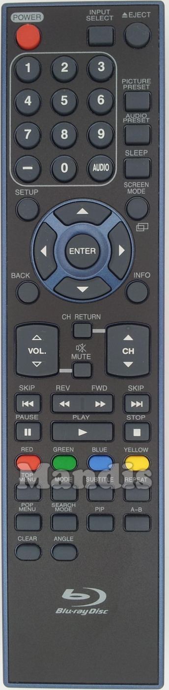Power, Input Select, Eject, Picture Preset, Audio Preset, Sleep, Screen Mode, Info, Back, Setup, 1, 2, 3, 4, 5, 6, 7, 8, 9, 0, Audio, --, Up, Down, Right, Left, Enter, CH Return, Mute, Vol+, Vol-, CH+, CH-, I<< Skip, <</REV, >>/FWD, Skip >>I, Pause, Stop, Play, Red, Green, Blue, Yellow, Mode, Subtitle, Repeat, A-B, PIP, Angle, Clear, Top Menu, Pop Menu, Search Mode