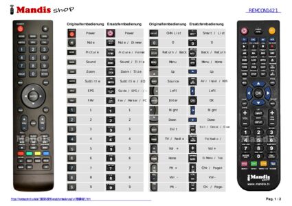Ein Dokument ist enthalten, um die Verwendung der neuen Fernbedienung zu erleichtern, indem es die Tastenbelegung zeigt.