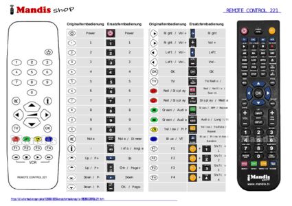 Im Folgenden zeigen wir Ihnen die Zuordnung jedes einzelnen Knopfes der Originalfernbedienung zu der Taste, die dieselbe Funktion auf der Ersatzfernbedienung ausführt. In einigen Fällen müssen Sie möglicherweise die UMSCHALT-Taste drücken, bevor Sie eine andere Taste drücken, um bestimmte Aktionen auszuführen. Diese zusätzlichen Funktionen werden oft wenig genutzt und dienen dazu, das Verständnis der Ersatzfernbedienung zu erleichtern oder weil die Originalfernbedienung mehr Tasten hat als das entsprechende Modell.
