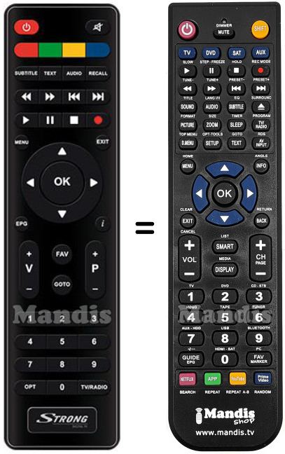 Below, we will show you the correspondence between each button on the original remote control and the button that performs the same function on the replacement remote control. In some cases, you may need to press the SHIFT key before pressing another button to perform certain actions. These additional functions are often not widely used and are included to facilitate understanding of the replacement remote control, or because the original remote control has more buttons than its equivalent.