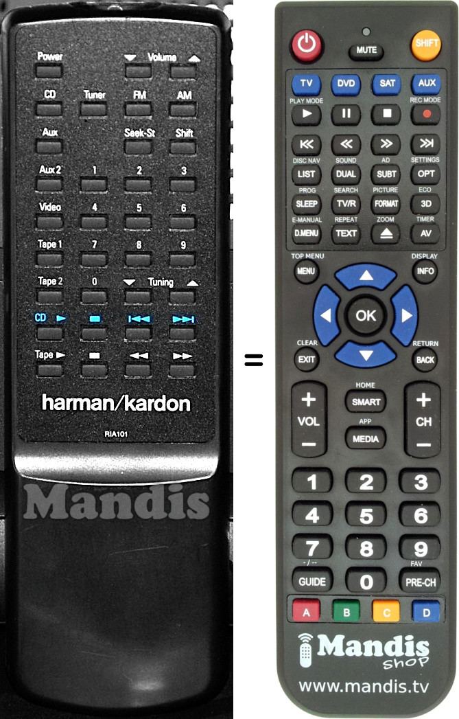 This remote control replaces most of the functions of your RIA101. It is not a universal remote control, but a copy with most of the buttons and functions of your original.