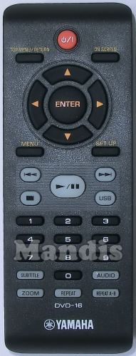 This remote control has the following buttons: Power, Top Menu/Return, On Screen, Up, Down, Left, Right, Enter, Menu, Set Up, I<<, >>I, Play/Pause, Stop, USB, 1, 2, 3, 4, 5, 6, 7, 8, 9, 0, Subtitle, Audio, Zoom, Repeat, Repeat A-B