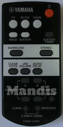 This remote control has the following buttons: Power, TV, BD/DVD, Coaxial, Analog, Bluetooth, Bluetooth Standby, Surround, Stereo, Clear Voice, Uni Volume, Audio Delay, Subwoofer+, Subwoofer-, Volume+, Volume-, Mute, Learn, Repeater