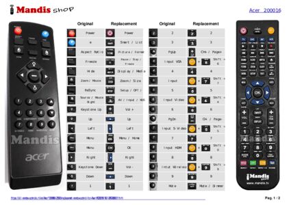 This remote control performs all the functions of the original remote control: Power, e, Aspect Ratio, Freeze, Hide, Zoom / Mouse Left, Resync, Source / Mouse Right, Up / Keystone Up, Down / Keystone Down, Right, Left, Menu, 1, 2, 3, VGA / 4, Component / 5, Video / 6, S-Video / 7, HDMI / 8, Wireless / 9, Mute / 0, PgUp, PgDn
