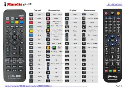 Below, we will show you the correspondence between each button on the original remote control and the button that performs the same function on the replacement remote control. In some cases, you may need to press the SHIFT key before pressing another button to perform certain actions. These additional functions are often not widely used and are included to facilitate understanding of the replacement remote control, or because the original remote control has more buttons than its equivalent.