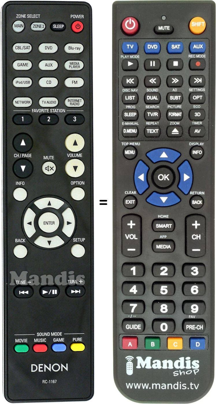 Below, we will show you the correspondence between each button on the original remote control and the button that performs the same function on the replacement remote control. In some cases, you may need to press the SHIFT key before pressing another button to perform certain actions. These additional functions are often not widely used and are included to facilitate understanding of the replacement remote control, or because the original remote control has more buttons than its equivalent.