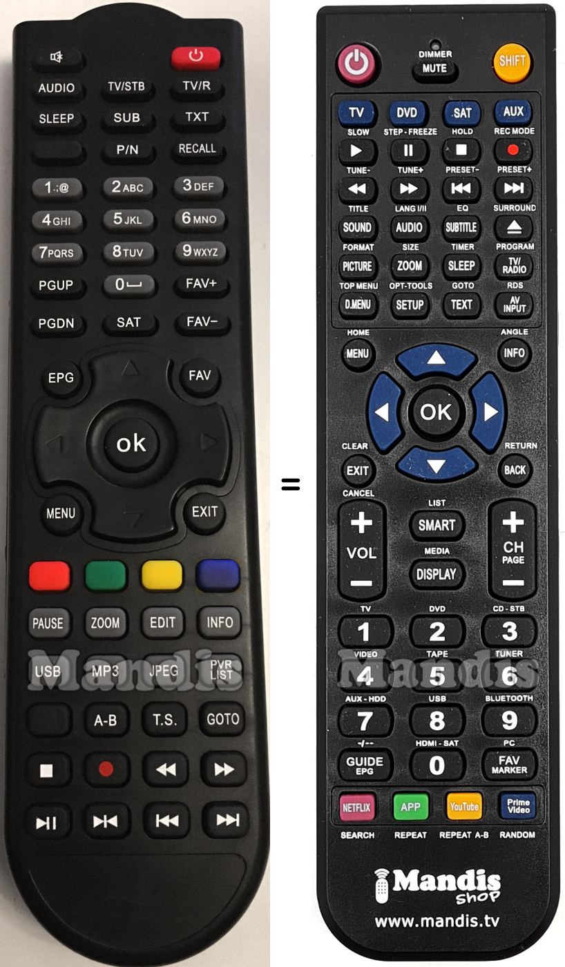 Below, we will show you the correspondence between each button on the original remote control and the button that performs the same function on the replacement remote control. In some cases, you may need to press the SHIFT key before pressing another button to perform certain actions. These additional functions are often not widely used and are included to facilitate understanding of the replacement remote control, or because the original remote control has more buttons than its equivalent.