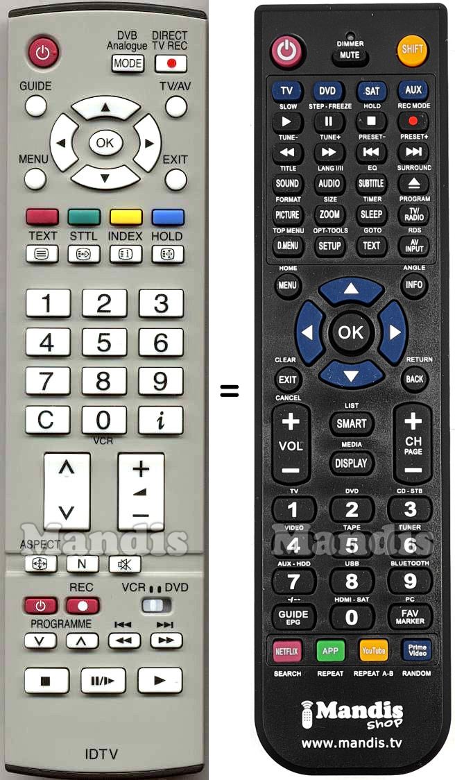 Below, we will show you the correspondence between each button on the original remote control and the button that performs the same function on the replacement remote control. In some cases, you may need to press the SHIFT key before pressing another button to perform certain actions. These additional functions are often not widely used and are included to facilitate understanding of the replacement remote control, or because the original remote control has more buttons than its equivalent.