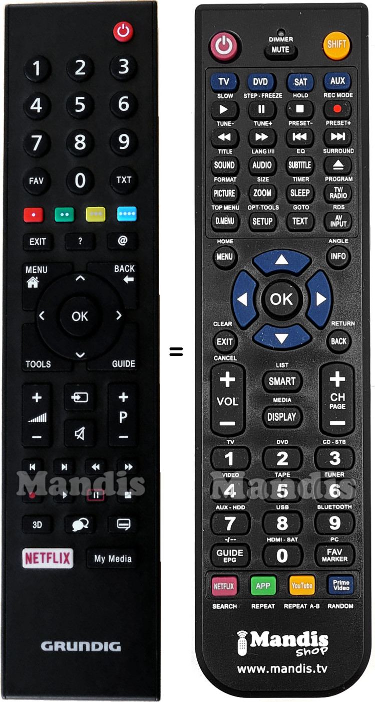 Below, we will show you the correspondence between each button on the original remote control and the button that performs the same function on the replacement remote control. In some cases, you may need to press the SHIFT key before pressing another button to perform certain actions. These additional functions are often not widely used and are included to facilitate understanding of the replacement remote control, or because the original remote control has more buttons than its equivalent.