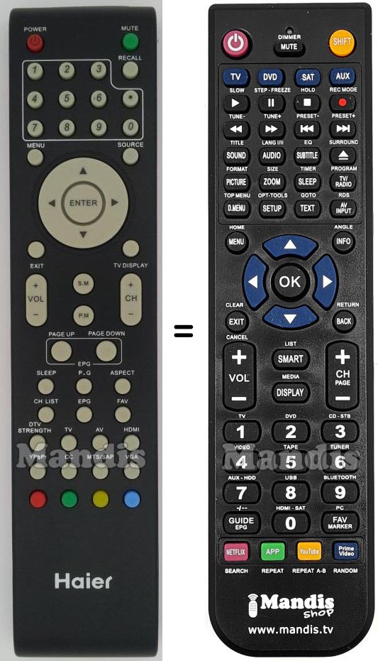 Below, we will show you the correspondence between each button on the original remote control and the button that performs the same function on the replacement remote control. In some cases, you may need to press the SHIFT key before pressing another button to perform certain actions. These additional functions are often not widely used and are included to facilitate understanding of the replacement remote control, or because the original remote control has more buttons than its equivalent.