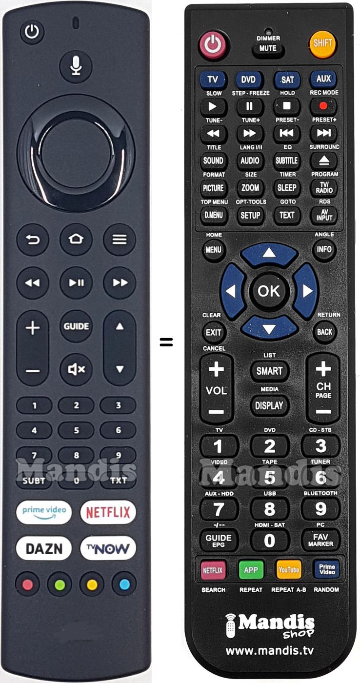 Below, we will show you the correspondence between each button on the original remote control and the button that performs the same function on the replacement remote control. In some cases, you may need to press the SHIFT key before pressing another button to perform certain actions. These additional functions are often not widely used and are included to facilitate understanding of the replacement remote control, or because the original remote control has more buttons than its equivalent.
