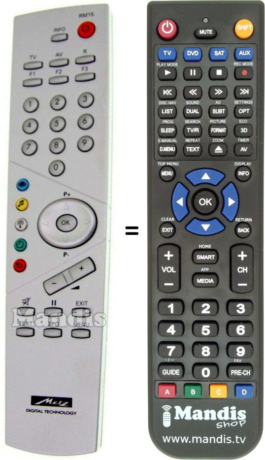 Below, we will show you the correspondence between each button on the original remote control and the button that performs the same function on the replacement remote control. In some cases, you may need to press the SHIFT key before pressing another button to perform certain actions. These additional functions are often not widely used and are included to facilitate understanding of the replacement remote control, or because the original remote control has more buttons than its equivalent.