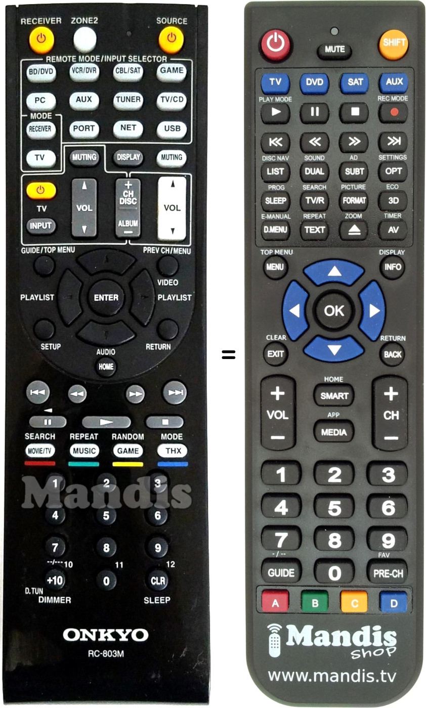 This remote control replaces most of the functions of your RC-803M. It is not a universal remote control, but a copy with most of the buttons and functions of your original.