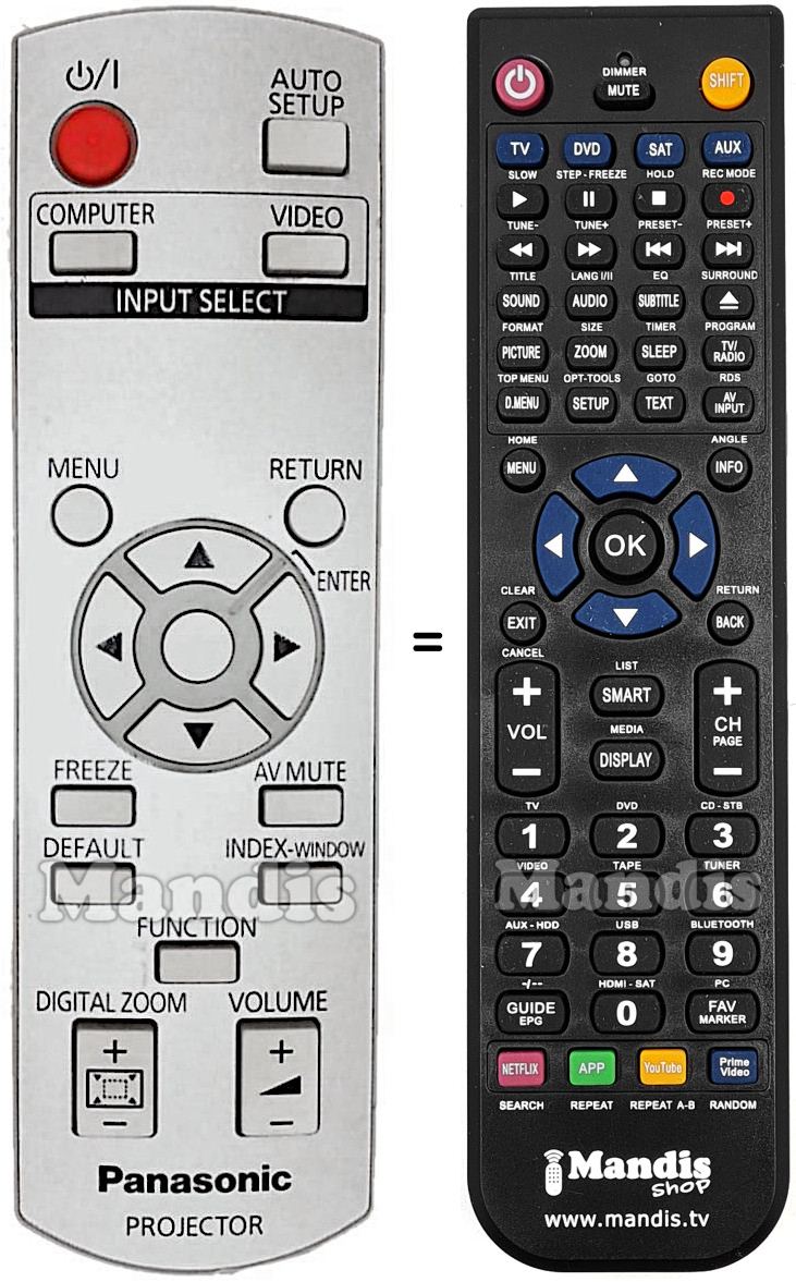 Below, we will show you the correspondence between each button on the original remote control and the button that performs the same function on the replacement remote control. In some cases, you may need to press the SHIFT key before pressing another button to perform certain actions. These additional functions are often not widely used and are included to facilitate understanding of the replacement remote control, or because the original remote control has more buttons than its equivalent.