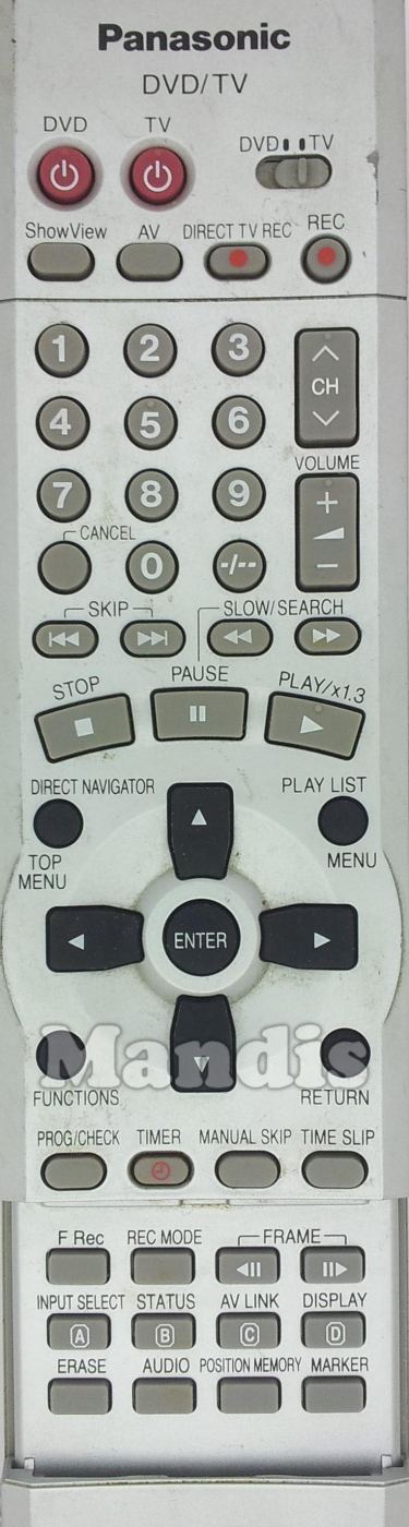 Power DVD, Power TV, Show View, AV, Direct TV Rec, Rec, 1, 2, 3, 4, 5, 6, 7, 8, 9, Cancel, 0, -/--, CH+, CH-, Vol-, Vol-, I<<, >>I, <<, >>, Stop, Pause, Play/x1.3, Direct Navigator/Top Menu, Play List/Menu, Up, Down, Left, Right, Enter, Functions, Return, Prog/Check, Timer, Manual Skip, Time Slip, F.Rec, Rec Mode, <II Frame, II> Frame, Input Select, Status, AV.Link, Display, Erase, Audio, Position Memory, Maker