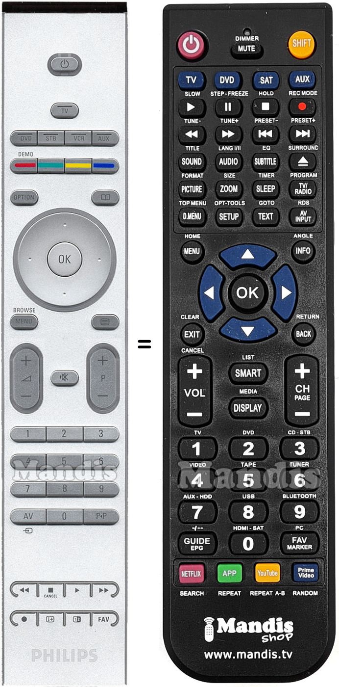 Below, we will show you the correspondence between each button on the original remote control and the button that performs the same function on the replacement remote control. In some cases, you may need to press the SHIFT key before pressing another button to perform certain actions. These additional functions are often not widely used and are included to facilitate understanding of the replacement remote control, or because the original remote control has more buttons than its equivalent.