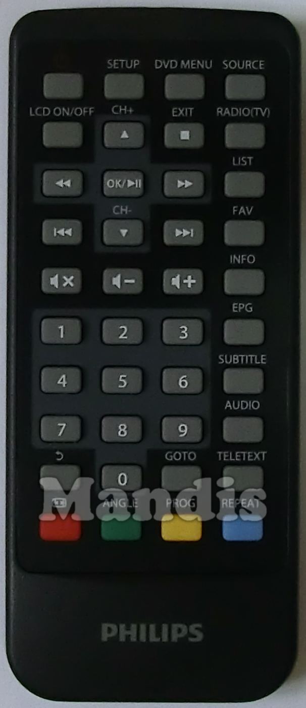 Setup, DVD Menu, Source, LCD On/Off, Up/CH+, Stop/Exit, Radio(TV), <<, >>, OK/Play/Pause, Down/CH-, I<<, >>I, Mute, Vol-, Vol+, List, FAV, Info, EPG, Subtitle, Audio, Teletext, Back, GOTO, Red, Green/Angle, Yellow/Prog, Blue/Repeat, 1, 2, 3, 4, 5, 6, 7, 8, 9, 0
