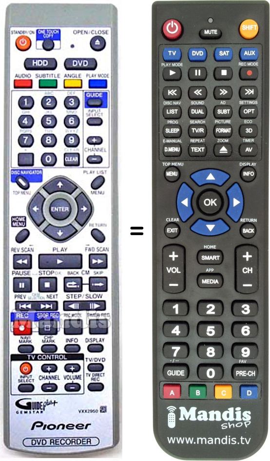 Below, we will show you the correspondence between each button on the original remote control and the button that performs the same function on the replacement remote control. In some cases, you may need to press the SHIFT key before pressing another button to perform certain actions. These additional functions are often not widely used and are included to facilitate understanding of the replacement remote control, or because the original remote control has more buttons than its equivalent.