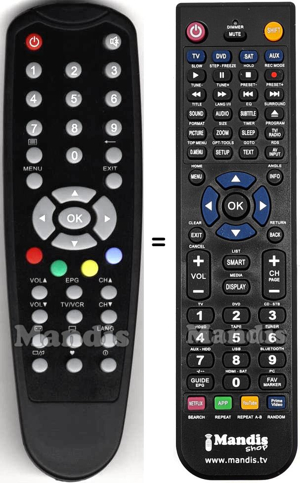 Below, we will show you the correspondence between each button on the original remote control and the button that performs the same function on the replacement remote control. In some cases, you may need to press the SHIFT key before pressing another button to perform certain actions. These additional functions are often not widely used and are included to facilitate understanding of the replacement remote control, or because the original remote control has more buttons than its equivalent.