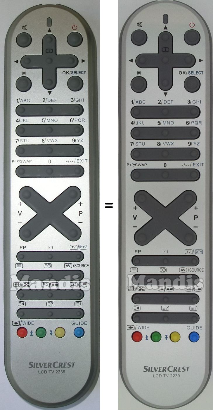 This remote control has the following buttons: Mute, Power, M, OK/Select, Up, Down, Right, Left, [i], 1, 2, 3, 4, 5, 6, 7, 8, 9, 0, P<P/Swap, -/--/ Exit, Vol+, Vol-, P+, P-, PP, I-II, Tv/DTV, [=], [=O], AV/Source, [=+]/[X], [=X]/[▪▪], [.=]/[ ▪], [=♦], [=?], [=i], Red/[+]/Wide/↑, Green/↓, Yellow, Blue/Guide
