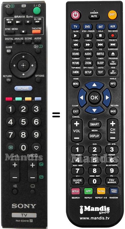 This remote control fully replaces your RM-ED 016 (148722811) and offers all the functions of the original.