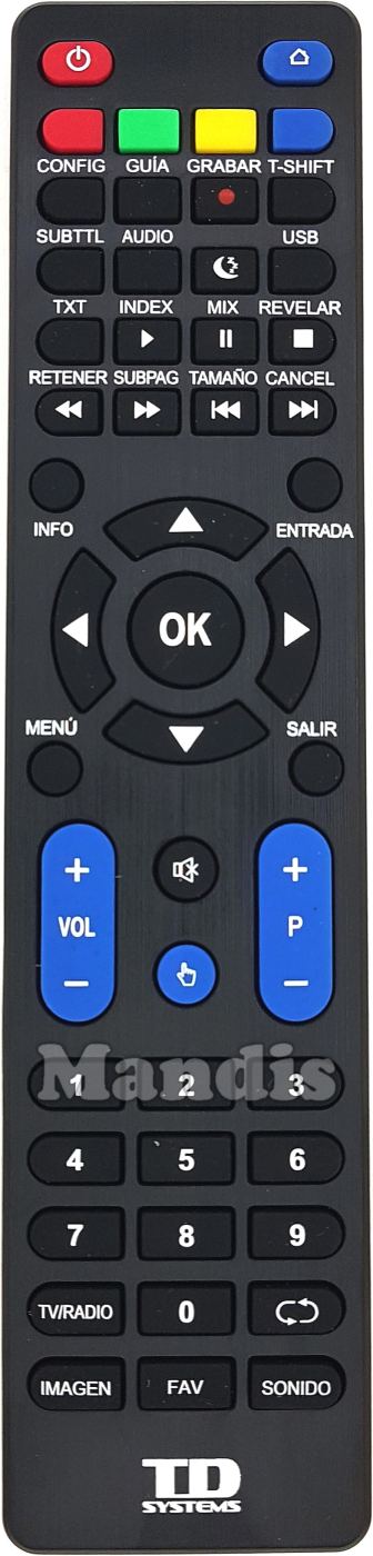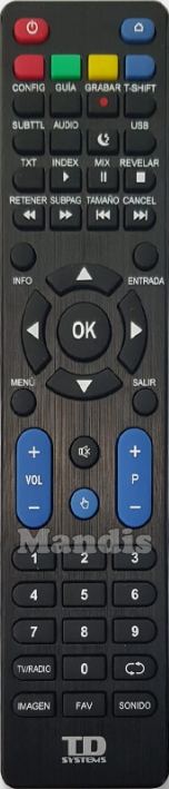 Power, Home, Red, Green, Yellow, Blue, Config, Guía, Grabar, T-Shift, Subttl, Audio, Sleep, USB, TXT, Play / Index, Pause / Mix, Stop / Revelar, << / Retener, >> / Subpag, I<< / Tamaño, >>I / Cancel, Info, Entrada, Menú, Salir, Up, Down, Right, Left, OK, Vol +, Vol -, Mute, Mano, P +, P -, 1, 2, 3, 4, 5, 6, 7, 8, 9, 0, TV / Radio, Prog. Ant., Imagen, Fav, Sonido