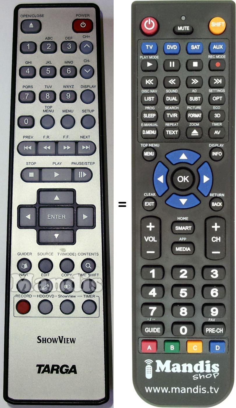 Below, we will show you the correspondence between each button on the original remote control and the button that performs the same function on the replacement remote control. In some cases, you may need to press the SHIFT key before pressing another button to perform certain actions. These additional functions are often not widely used and are included to facilitate understanding of the replacement remote control, or because the original remote control has more buttons than its equivalent.