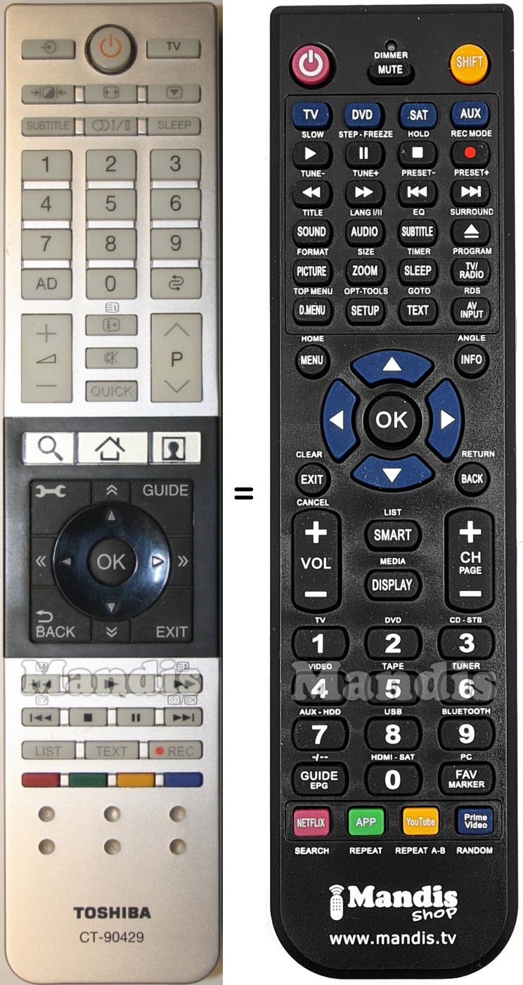 Below, we will show you the correspondence between each button on the original remote control and the button that performs the same function on the replacement remote control. In some cases, you may need to press the SHIFT key before pressing another button to perform certain actions. These additional functions are often not widely used and are included to facilitate understanding of the replacement remote control, or because the original remote control has more buttons than its equivalent.