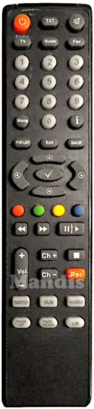 Power, TXT, Mute, TV / Radio, Guide, Fav, 1, 2, 3, 4, 5, 6, 7, 8, 9, 0, Menu, i, PVR List, Exit, Back, Up, Left, OK, Right, Down, Red, Green, Yellow, Blue, <<, >>, Pause / Play, Vol+, Vol-, Ch+, Ch-, Stop, Rec, Ratio, SUB, Audio, Page Up, Page Down, L/R