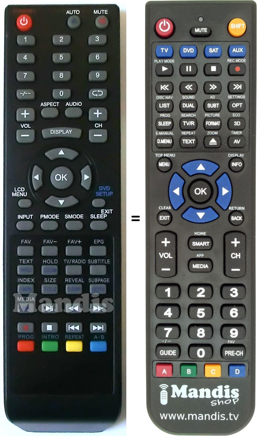 Ci-dessous, nous vous montrerons la correspondance entre chaque bouton de la télécommande d'origine et le bouton qui effectue la même fonction sur la télécommande de remplacement. Dans certains cas, vous devrez peut-être appuyer sur la touche SHIFT avant d'appuyer sur un autre bouton pour effectuer certaines actions. Ces fonctions supplémentaires sont souvent peu utilisées et sont incluses pour faciliter la compréhension de la télécommande de remplacement, ou parce que la télécommande d'origine comporte plus de boutons que son équivalent.
