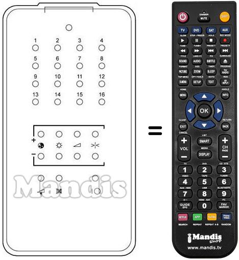 Télécommande qui remplace celle d'origine car elle possède les mêmes fonctions. Il ne s'agit pas d'une télécommande universelle mais d'une télécommande qui remplace celle d'origine. Vous recevrez la télécommande prête à fonctionner, vous n'aurez qu'à mettre les piles. Il n'est pas nécessaire de la programmer. Nous vous garantissons que la télécommande aura exactement les mêmes fonctions que celle d'origine.