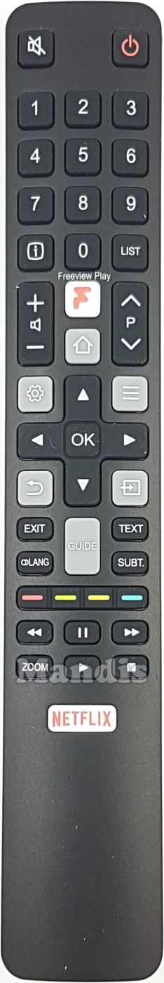 Power, Mute, 1, 2, 3, 4, 5, 6, 7, 8, 9, 0, Info, List, Vol+, Vol-, Freeview Pay, Home, P+, P-, [=], ☼, Back, Input, Guide, Up, Down, Right, Left, OK, EXit, Text, Subt., Lang, Red, Green, Yellow, Blue, <<, Pause, >>, Stop, PLay, Zoom, Netflix