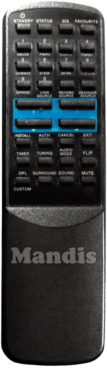 Standby, Status, SIS, Favourite, 1, 2, 3, 4, 5, 6, 7, 8, Record Source, 0 / View Source, Decoder Source, 9, CH Down, CH Up, Vol-, Vol+, Install, Auth, Cancel, Exit, Timer, Tuning, Audio Mode, Flip, DPL / Custom, Surround, Sound, Mute