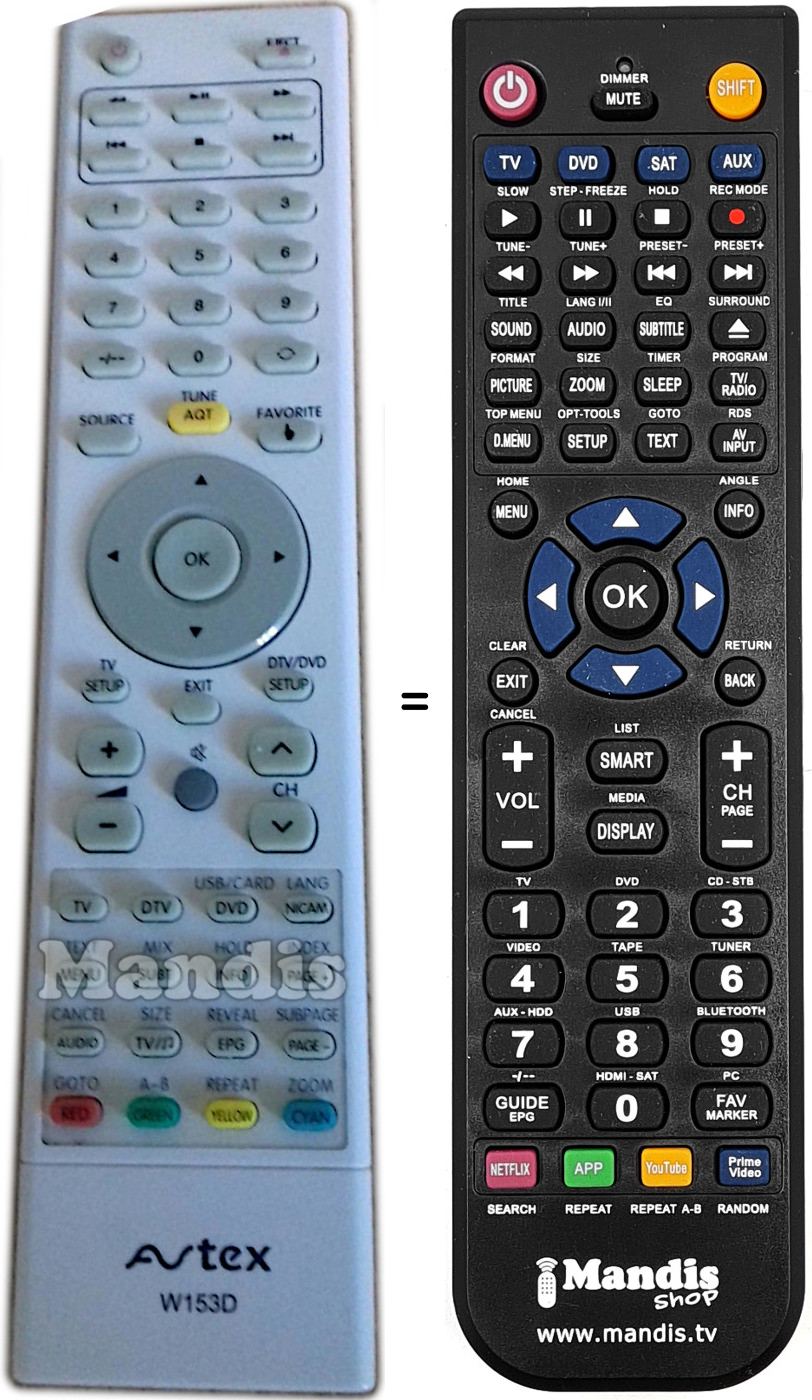 Télécommande qui remplace la télécommande d'origine W153D car elle possède les mêmes fonctions.