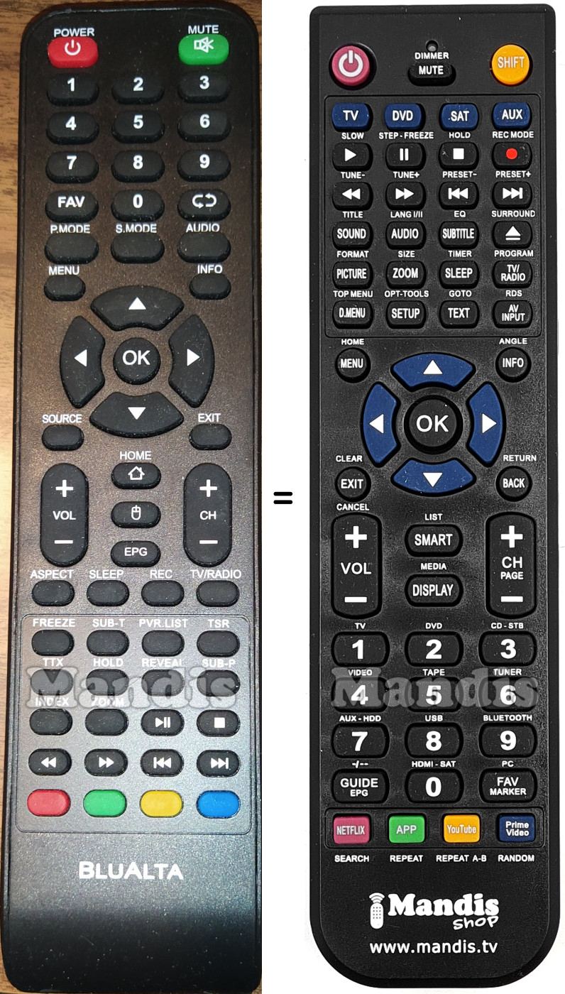 Ci-dessous, nous vous montrerons la correspondance entre chaque bouton de la télécommande d'origine et le bouton qui effectue la même fonction sur la télécommande de remplacement. Dans certains cas, vous devrez peut-être appuyer sur la touche SHIFT avant d'appuyer sur un autre bouton pour effectuer certaines actions. Ces fonctions supplémentaires sont souvent peu utilisées et sont incluses pour faciliter la compréhension de la télécommande de remplacement, ou parce que la télécommande d'origine comporte plus de boutons que son équivalent.