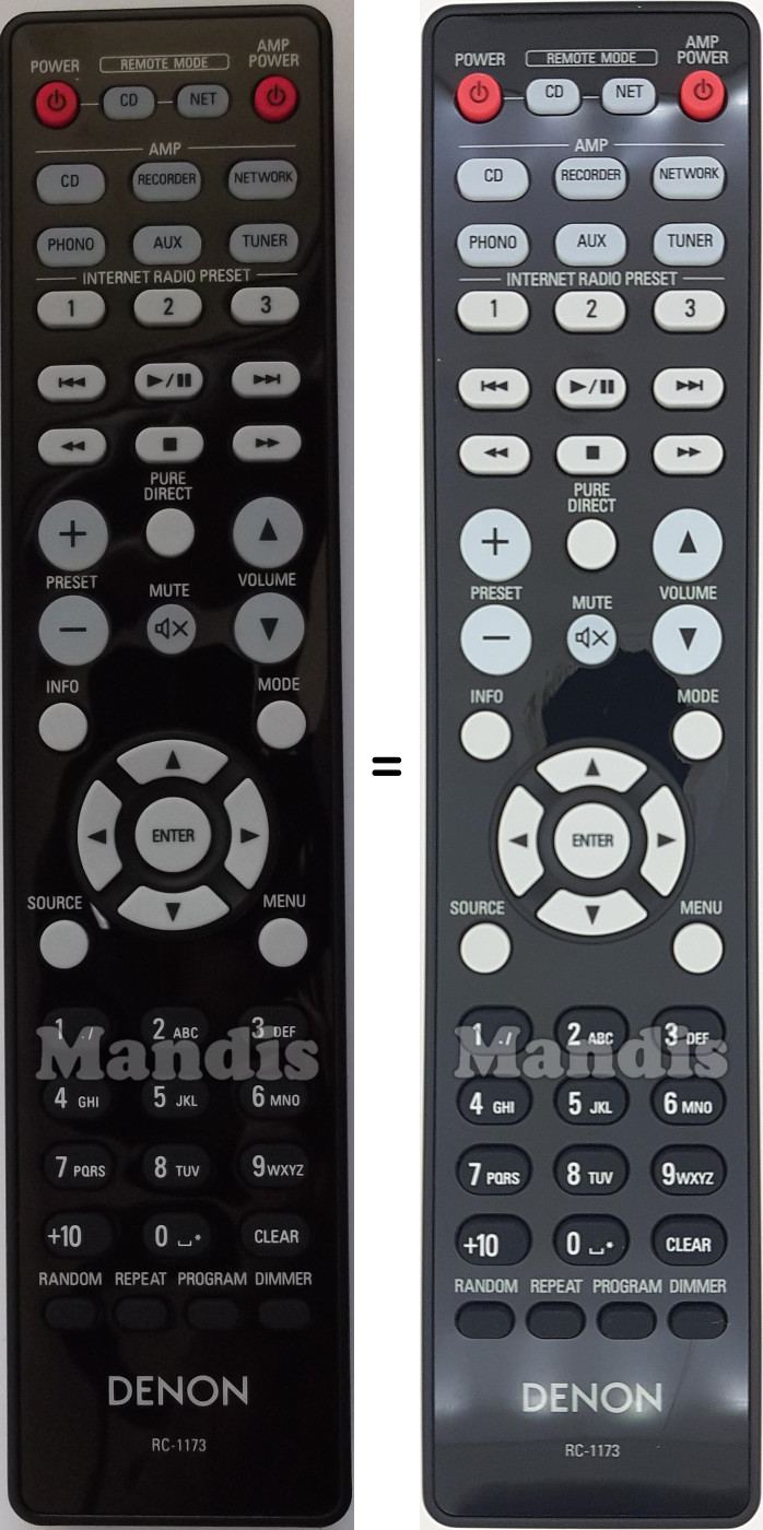 Télécommandes équivalentes qui remplacent la télécommande DENON RC 1173 (943307101180D) et possèdent exactement les mêmes fonctions :