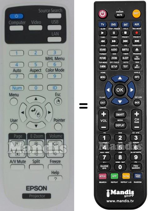 Cette télécommande remplit toutes les fonctions de la télécommande d'origine: Power, Source Search, Computer, Video, USB, LAN, 1, 2, 3, 4, 5, MHL Menu, Auto, Aspect, 6, Color Mode, 7, 8, 9, 0, Menu, Esc, User, Pointer, Up, Down, Right, Left, Enter, A/V Mute, Split, Freeze, ?/Help, Page Up, Page Down, E-Zoom+, E-Zoom-, Vol+, Vol-, ID