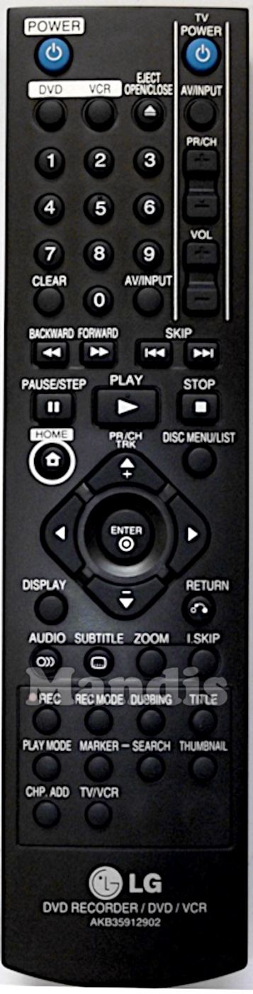 Power, DVD, VCR, Eject / Open/Close, 1, 2, 3, 4, 5, 6, 7, 8, 9, 0, Clear, AV/Input, TV Power, TV AV/Input, TV PR/CH+, TV PR/CH-, TV Vol+, TV Vol-, Backward, Forward, I<< SkipForwar4, Skip >>I, Pause / Step, Play, Stop, Home, Disc Menu / List, Up / PR/CH+ / TRK+, Down / PR/CH- / TRK-, Left, Enter, Right, Display, Return, Audio, Subtitle, Zoom, I.Skip, Rec, Rec Mode, Dubbing, Title, Play Mode, Marker, Search, Thumbnail, CHP. ADD, TV / VCR